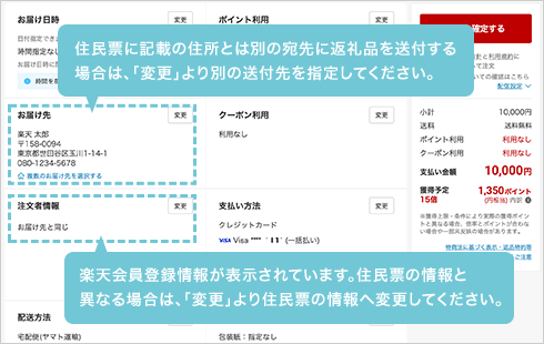 ふるさと納税を行い、税金の控除を受けるためには、寄付申込みの際、住民票に記載されている氏名・住所の登録が必要です。楽天ふるさと納税では、注文確認画面の「注文者情報」を寄付者の住民票の情報とみなします。寄付を行う前に、必ず以下どちらかの方法より、正しい情報が登録されているかご確認ください。