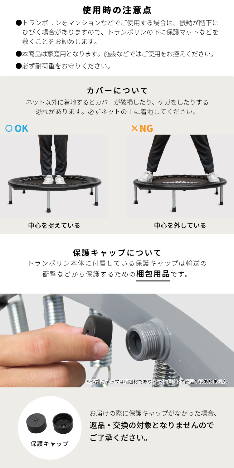 ご家庭で安全に楽しんでいただくため、一般的なトランポリン同様の注意点をまとめています。ポイントは上の5項目となります。